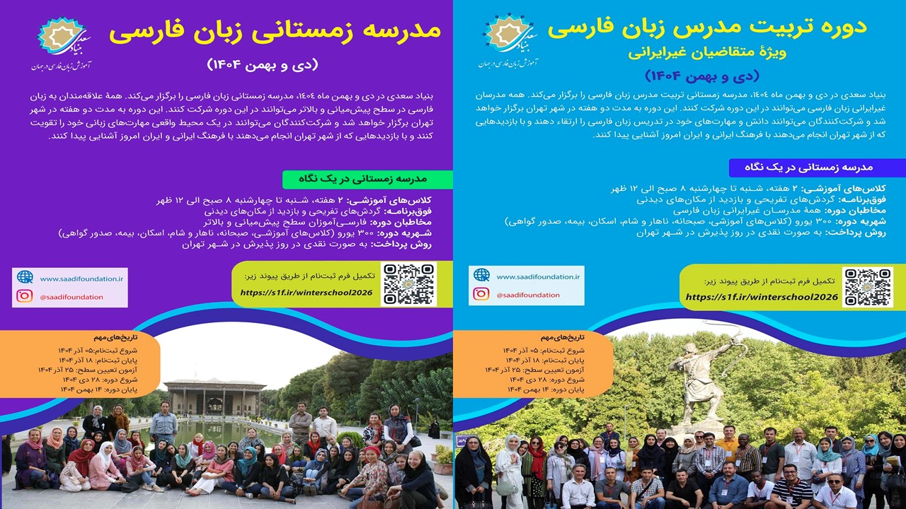 بنیاد سعدی در دی و بهمن ماه 1404، مدرسه زمستانی زبان فارسی را برگزار میکند. این دوره به مدت دو هفته در شهر تهران برگزار خواهد شد. همچنین بنیاد سعدی یک دوره تربیت مدرس زبان فارسی را نیز برگزار می نماید. همه مدرسان غیر ایرانی زبان فارسی میتوانند در این دوره شرکت کنند.